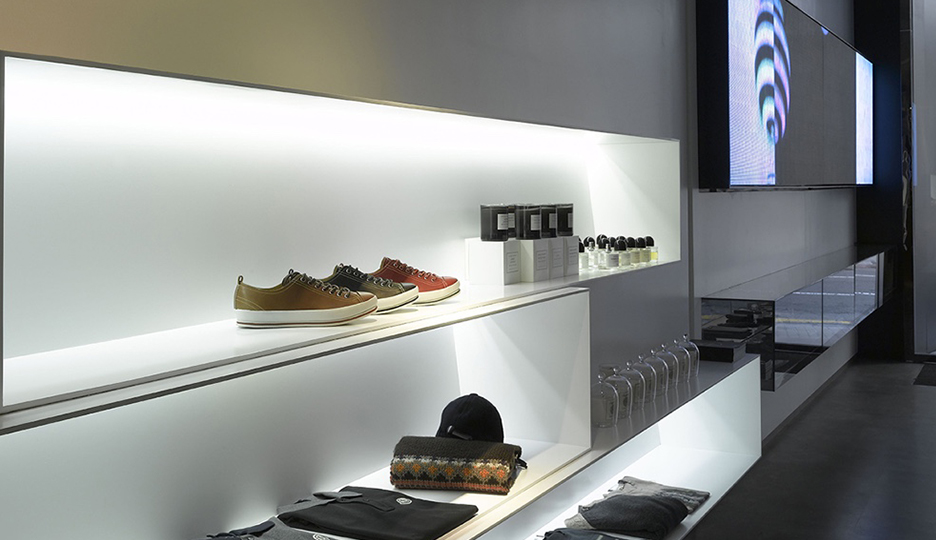 Una gran marquesina de acero negro que se ilumina a través de las aberturas enmarca la fachada de cristal de la tienda. El recorrido dentro de la tienda propone una secuencia de escenas que comienzan en el acceso, dominado por dos grandes pantallas de LED con composiciones de video. La siguiente escena se define por largas piezas que se desprenden de las paredes donde se encuentran los volúmenes de piedra que emergen de la tierra, conectando los espacios entre las zonas de ambos sexos. Al llegar a los probadores las áreas se vuelven a separar visualmente. Al final, el espacio se une de nuevo coronado por una claraboya que inunda de luz natural el interior de la tienda. Esta progresión de espacios organiza la tienda en áreas que resaltan la identidad de las colecciones con el fin de darle valor a cada una de las marcas expuestas.